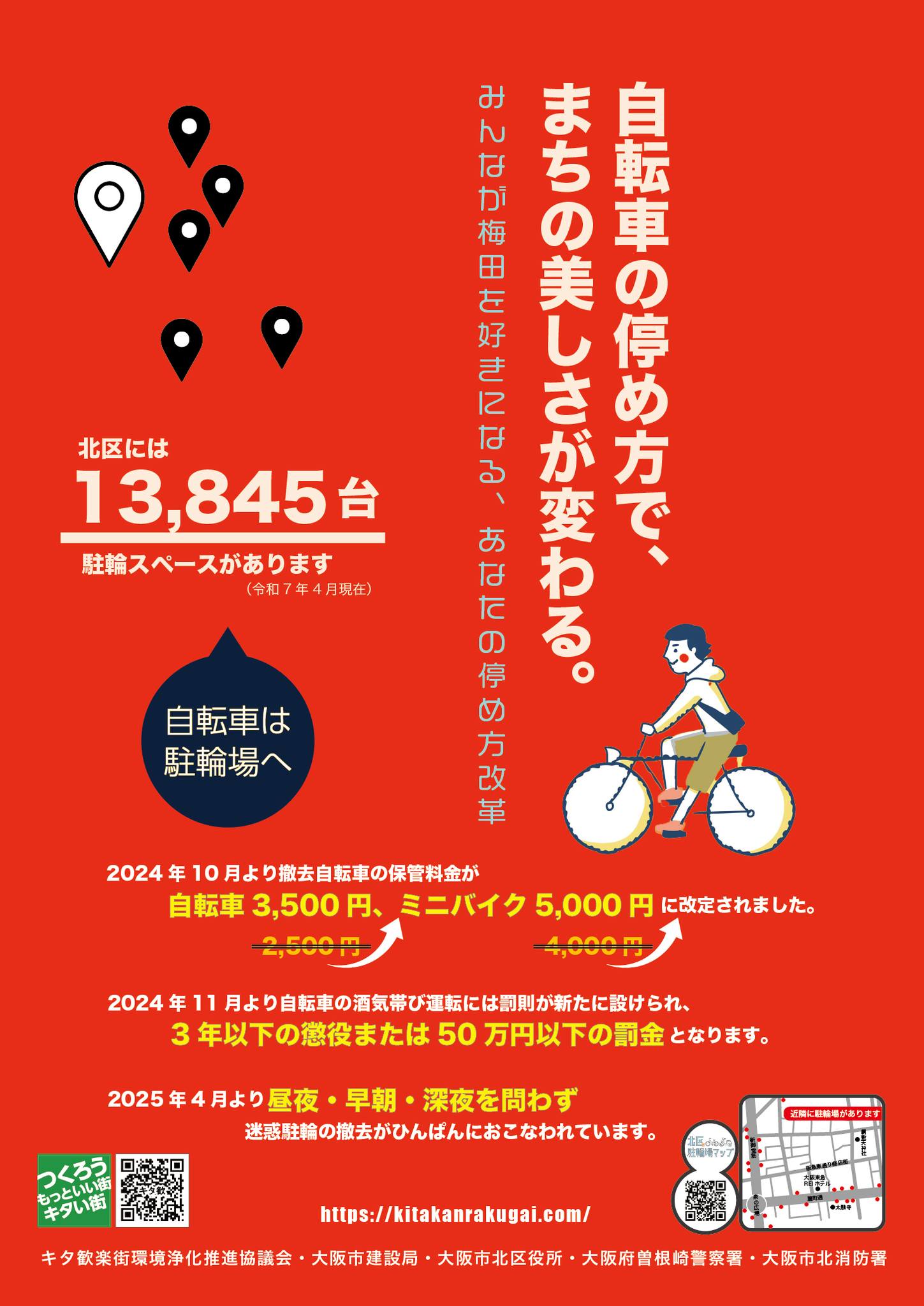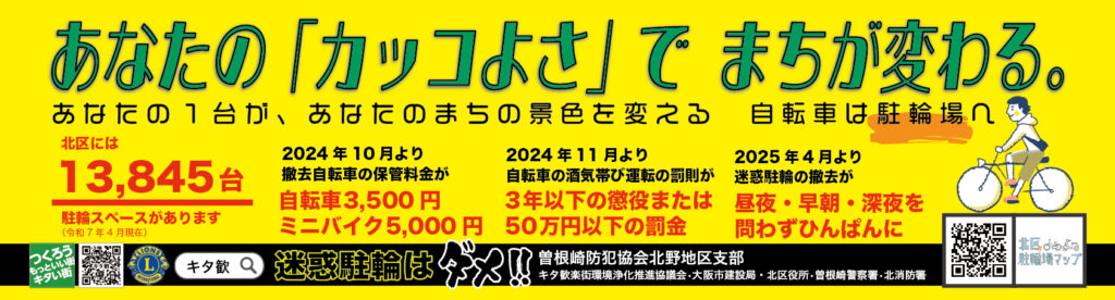 キタ歓楽街環境浄化推進協議会では毎月の青色防犯パトロールや迷惑駐輪撤去立ち会いなどで、迷惑駐輪が文字通りまちの迷惑になっているからやめようと!と啓発するエフを自転車につけたり、チラシを配ったり、ポスターを貼ってもらったりしています。