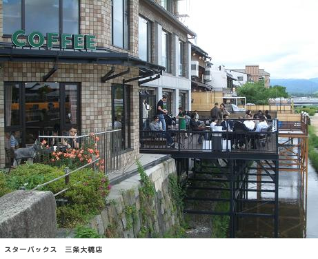 | スタバ史上ナンバーワンの眺望 禁煙大国アメリカの意向を存分に体現しているスタバなど、まったくもってどうでもいいのだが、この、三条大橋店だけはべつかもしれない。少なくともテラス席ではタバコが吸える。まあ、どこのスタバであってもテラス席のあるところならタバコが吸えるのだが、そもそも、テラス席って、風が吹いたり、天候がモロに影響するので、それほど好きではない。あんなもの、天候が安定しているスペインあたりで通用する文化であって、なにも四季折々の日本にほいそれと導入しなくてもいいのだ。 と、ここまで意地悪に悪口を書いておいて、なぜこの店だけべつなのかというと、眺望、それに尽きる。この店のテラス席からの眺望の素晴らしさにだけは、逆らえない。スタバ史上最高の眺望の呼び声も高いが、その看板に偽りはない。ここから見下ろす鴨川は絶品! 改築してある建物も、もともとはなんの建物だったか知らないが、レトロで味わい深い。きっと、由緒ある建物のはずである。 |