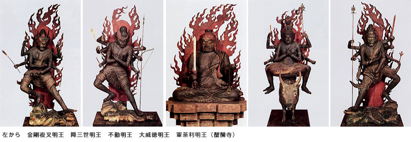 | 檜材の一木造りで、アーリア系らしい、長く伸びる手足の構えが迫力に満ちている。巨大な眼を見開き、長い牙をむき出しにして怒りにひきつる顔面が強いインパクトを与える。歩行する水牛に坐す大威徳明王の姿が異彩を放っている。あの水牛の眼は、どこを見据えているのだろうか。退蔵界か?金剛界か? |