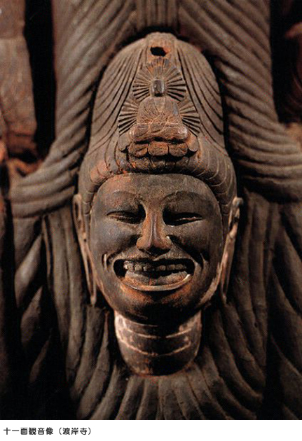 | 笑っている。十一面観音とは、人々のさまざまな苦難に対応するためにすべての方向に顔を向けた観音で、変化観音のうちもっとも早く考え出された。頭部に十一の顔を表し、それぞれ人々の苦しみを救う力を秘めている。11個の顔ですべての方向を見つめ、苦しんでいる人を一人でも多く発見し、救い出そうとしている。十一面観音の最大の肝は後頭部の暴悪大笑面にある。悪事を笑っているのだ。邪悪なものを打ち倒す力は、笑いが一番ということか。この寺は観音様の後頭部にある暴悪大笑面を拝観者が鑑賞出来るように、観音様の背後に通路があるうえ(普通は仏の背後にまわりこめない)、わざわざ大笑面にスポットライトを当てている。 |