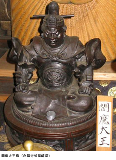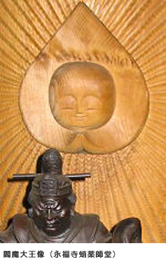 | 閻魔大王の両袖が風圧でめくれ上がっており、怒髪天を突く形相は圧巻のひとことなのだけれども、その背後には、桃太郎のようなかわいらしい太陽が燦々と輝く……。正直、解釈に苦しむ。 |