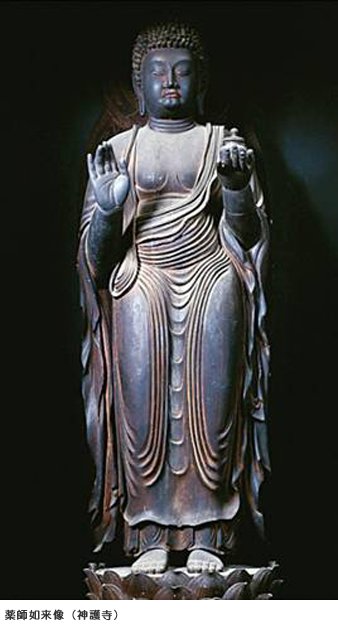 | 樹の霊力を像に取り込んだ、一木丸彫像。身体はねじまがり、太腿は異様な盛り上がりを見せている。均衡や写実とは無縁の造形を生み出しているのは、深く洗い彫りである。病を払う薬師如来の、ある極点の表現を示す傑作だろ う。 |
