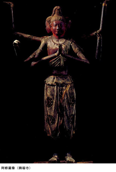 | 興福寺には将軍万福の手による八部衆と十大弟子がおり、その中央に阿修羅がいる。この乾漆像の魅力は、やはり整った顔立ちとリアルな表情にある。凛々しい少年の澄んだ瞳の奥に、憂いの色が見てとれる。この、悲しそうでもあり苦しそうでもある表情が、見る人の眼を捉えて離さないのだろう。とてもエロティックな像だ。 |