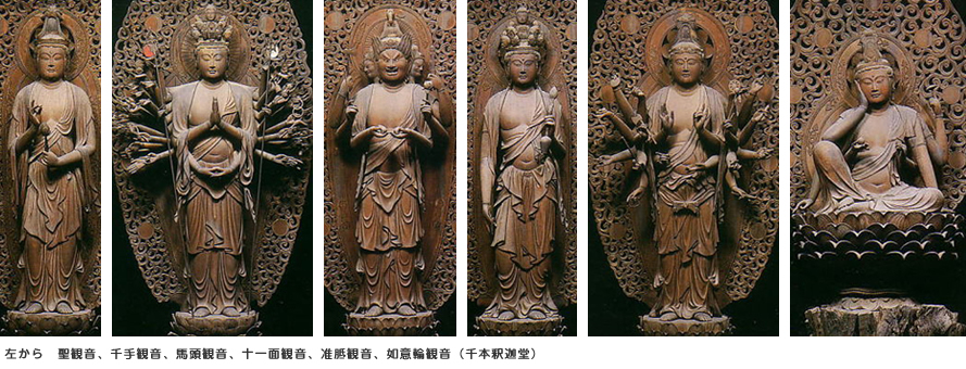 京都・千本釈迦堂(大報恩寺)は、応仁の乱の兵火を奇跡的に免れた京都最古の寺である。観音菩薩は主に6形態あるが、この大報恩寺の霊宝館には6バージョンすべての観音が勢揃いしている。このように完全なかたちで残っているのは、日本でもこの寺だけだそうだ。各仏の高さは190cmもあり、ズラリと居並ぶと壮観である。